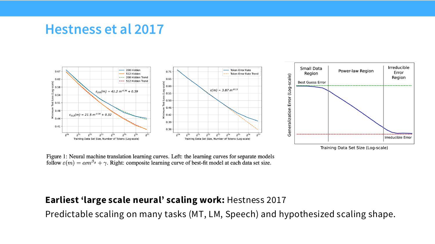 真正大规模的神经网络缩放定律实证是 Hestness et al. 2017(那时他们在百度),用机器翻译、语音、语言建模多个任务验证了误差以幂律形式下降。更重要的是他们提出了一个三段式框架:随机猜测区、幂律区、不可约误差区。