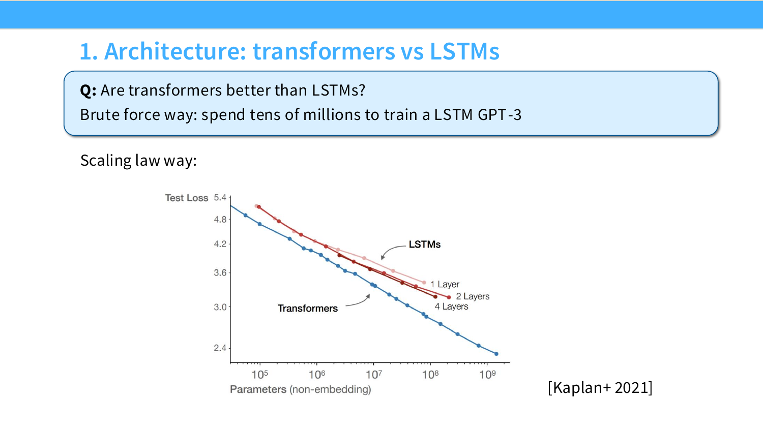 传统做法是把候选架构都训到 GPT-3 规模再比。缩放定律的做法是在多个计算量级上都训一批,看曲线形状和相对偏移。