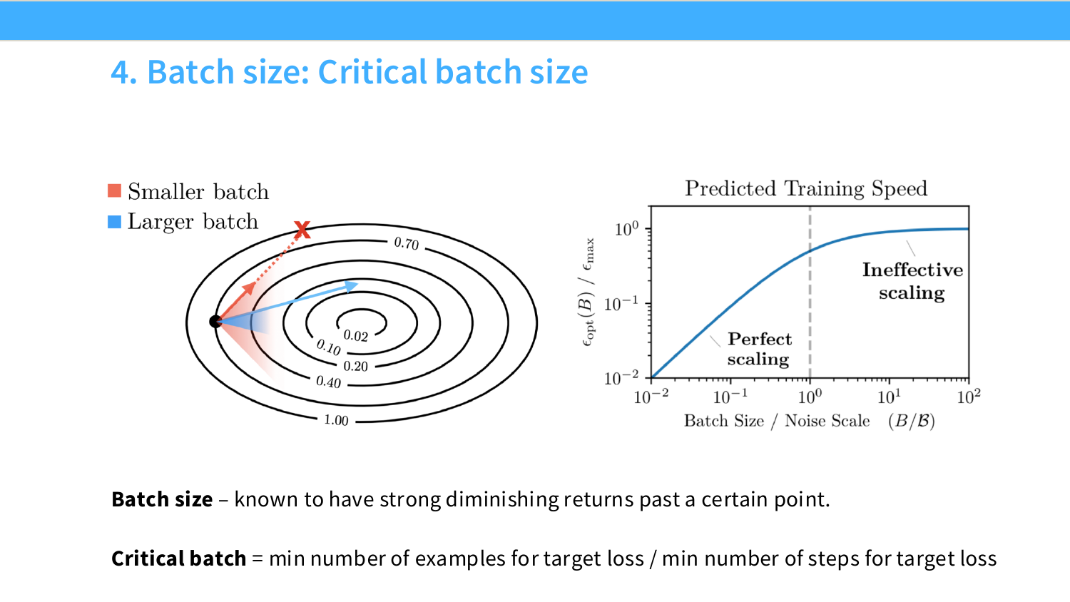 稍微补充一个常被忽视的细节。Batch size 小于某个阈值时,加倍 batch size 近似等于多走一步梯度,系统并行和优化效率同时赚到。超过这个阈值之后,额外样本不再减少有效噪声,进入边际递减。这个阈值就是 critical batch size。