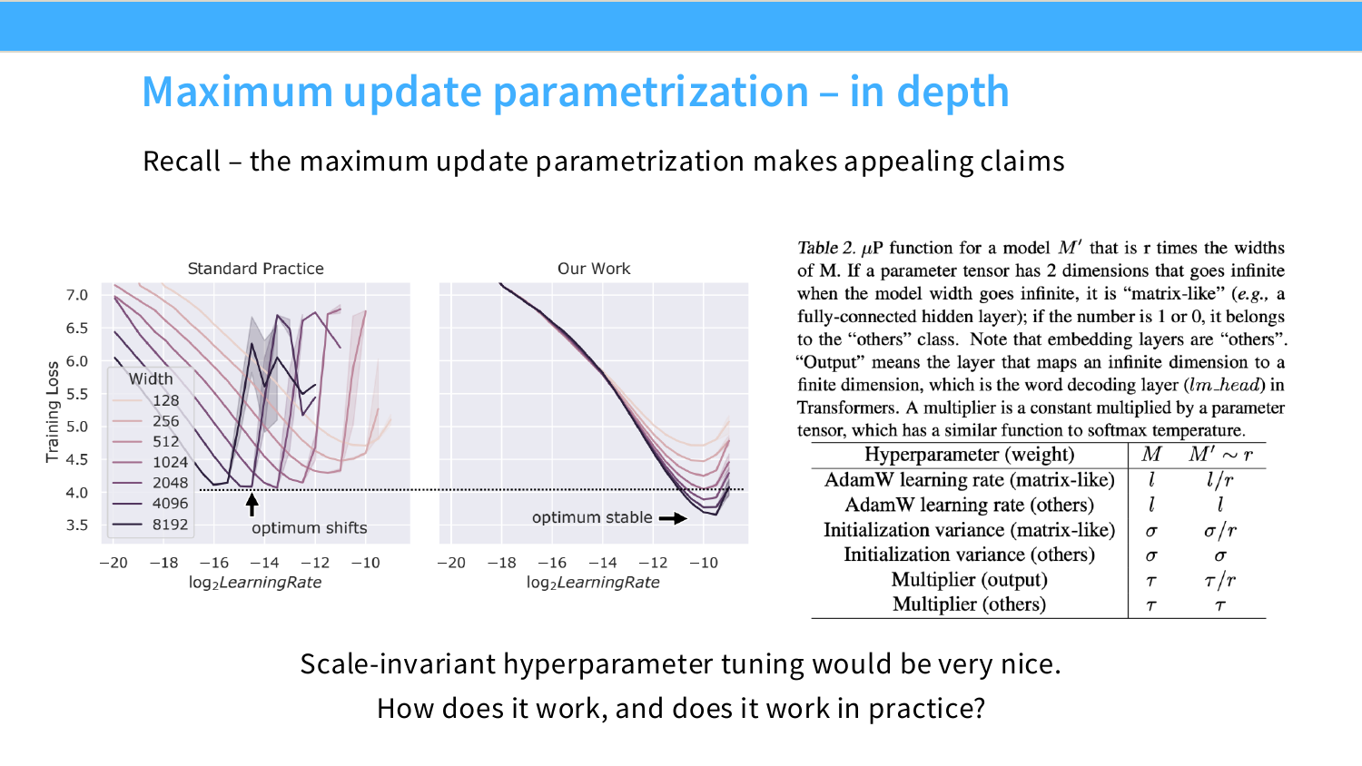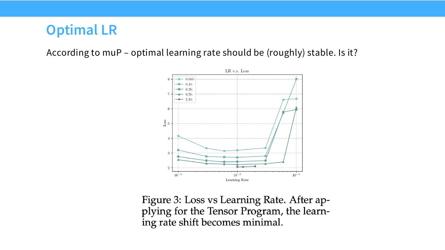 上图左边是标准参数化(Standard Practice):不同宽度的模型,最优学习率(图中各条曲线的最低点)持续向左漂移。右边是 muP:最低点在同一位置稳定不动。这就是 muP 解决的问题——让超参数跨规模稳定,一次调好,直接用到大模型。