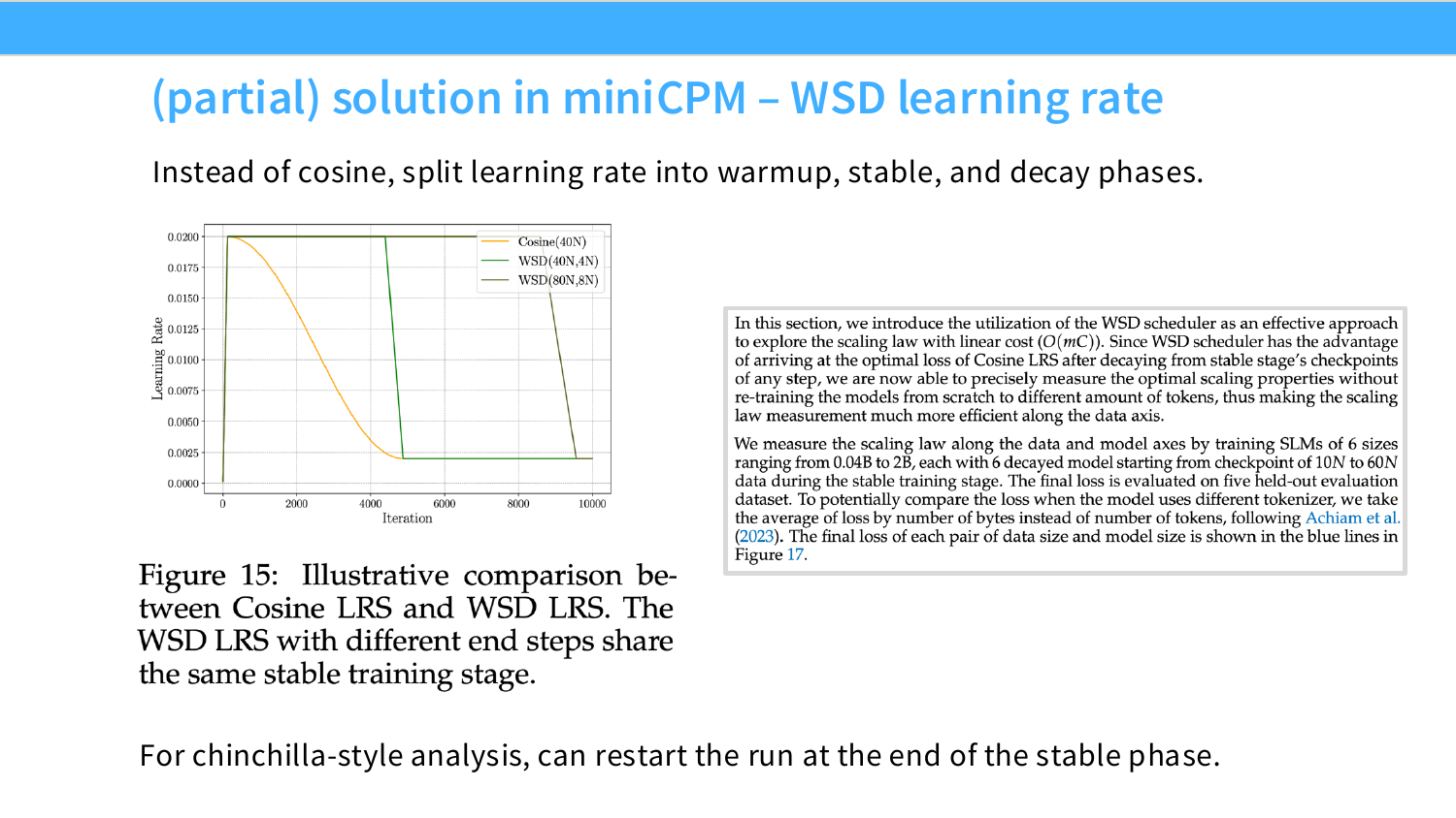 WSD 调度器:不是因为它比余弦更好,而是因为它让 Chinchilla 分析的成本从 降到 。工程 hack,不是理论突破。