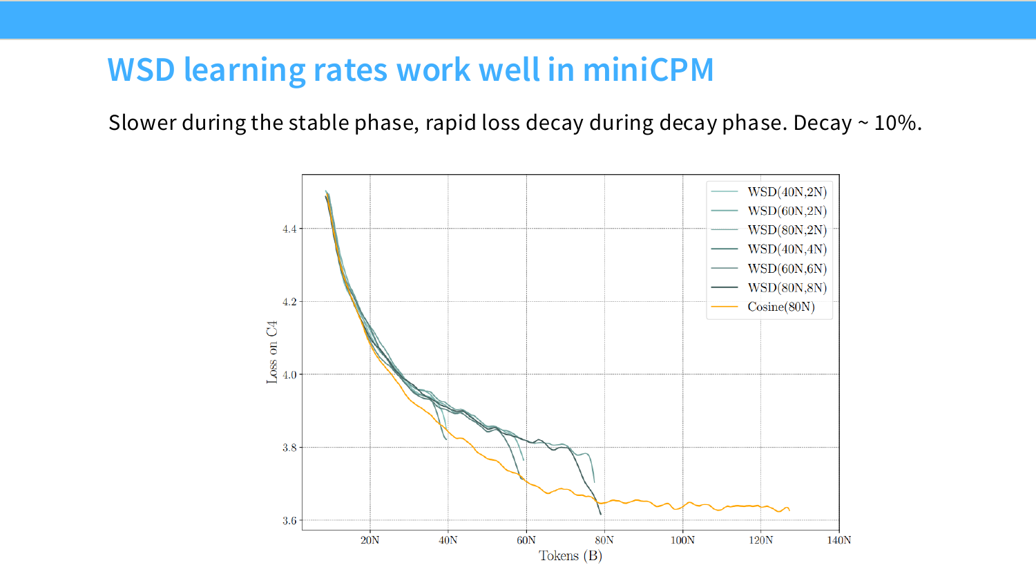 WSD 把学习率变成梯形——上升、平台期、下降。平台期的 checkpoint 可以复用,只需从某个节点开始下降就等同于完整训练到那个 token 数的结果,代价降到 。